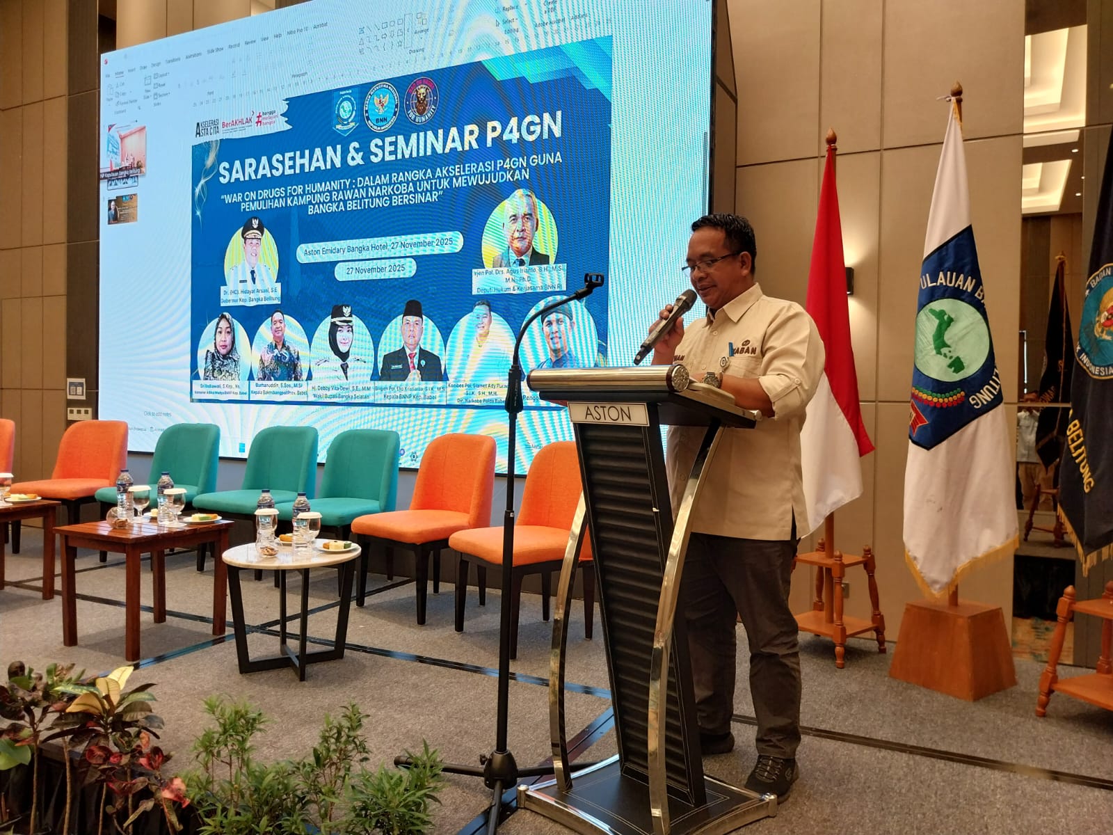 Babel,LibangNews.Com- Pemerintah Provinsi Kepulauan Bangka Belitung (Babel) bersama Badan Narkotika Nasional Provinsi (BNNP) Babel menggelar Sarasehan dan Seminar Pencegahan, Pemberantasan, Penyalahgunaan dan Peredaran Gelap Narkotika (P4GN) bertema “War on Drugs for Humanity”, Kamis (27/11/2025) di Aston Emidary Bangka Hotel & Conference Center.