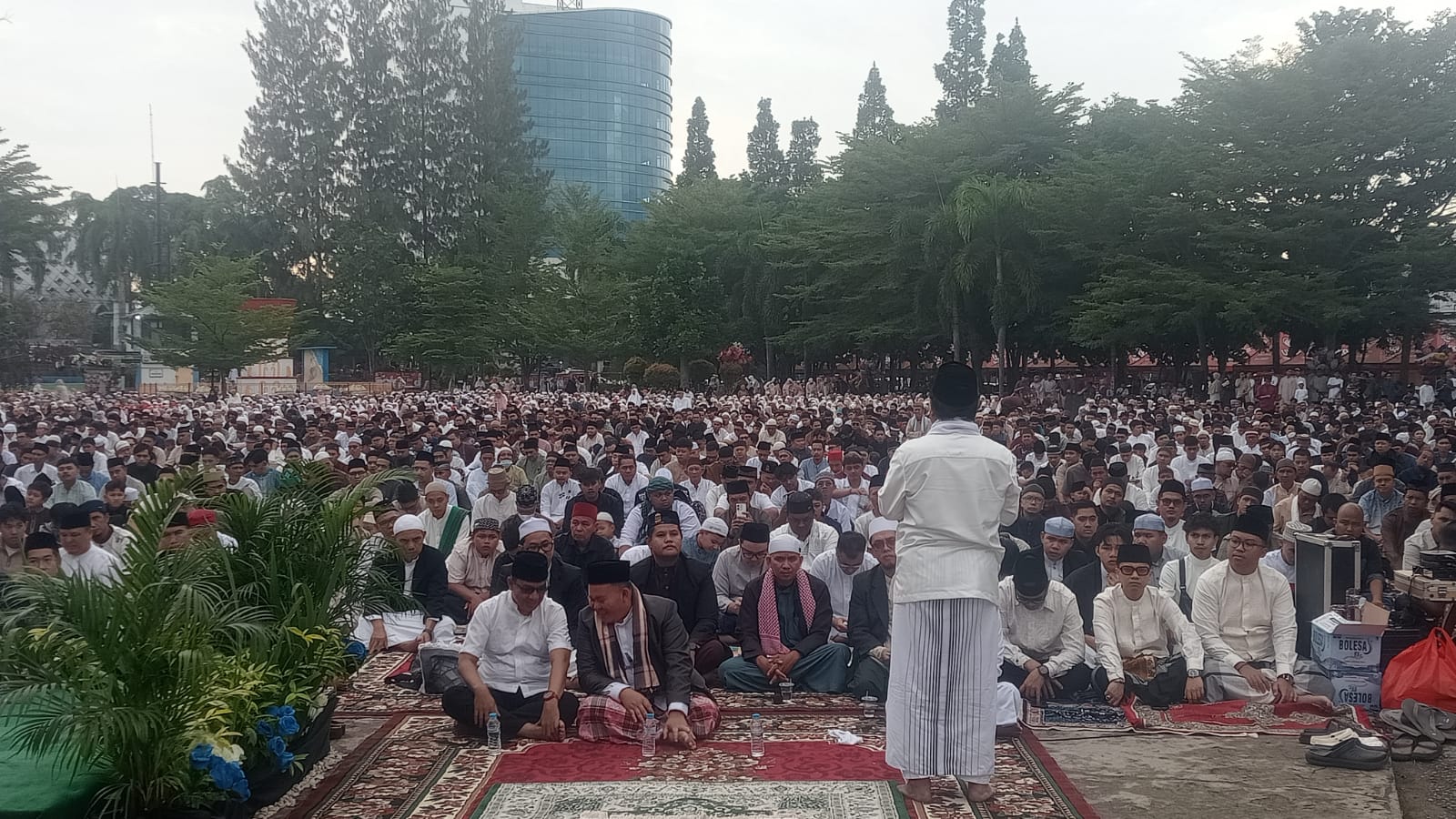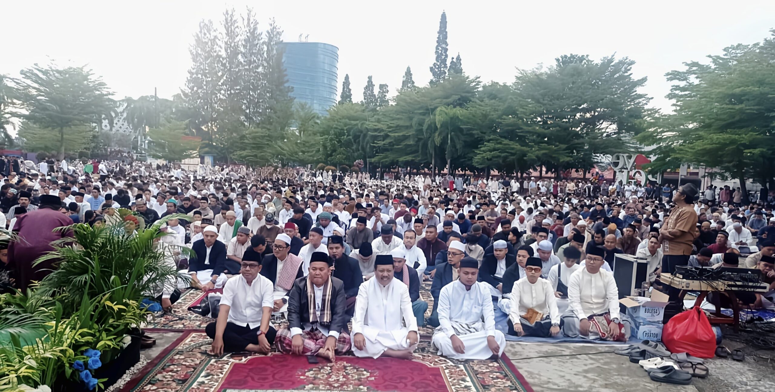 Sejak subuh, jemaah mulai berdatangan dari berbagai penjuru kota. Mereka memadati area pelaksanaan salat dengan tertib, membentuk saf yang rapi di seluruh penjuru lapangan. Kondisi ini mencerminkan kesiapan panitia serta dukungan Pemerintah Kota dalam mengatur jalannya kegiatan.